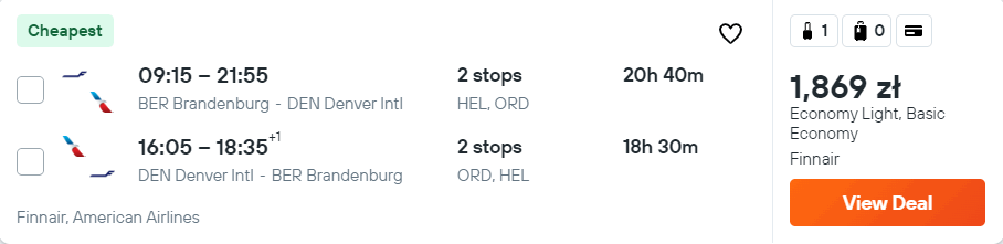 Wycieczkę do Denver rozpoczniesz i zakończysz w porcie lotniczym Berlin Brandenburg. W obie strony polecisz na pokładach samolotów linii American Airlines oraz Finnair. Bez dodatkowych kosztów zabrać ze sobą możesz bagaż podręczny oraz przedmiot osobisty (mały plecak lub damską torebkę).