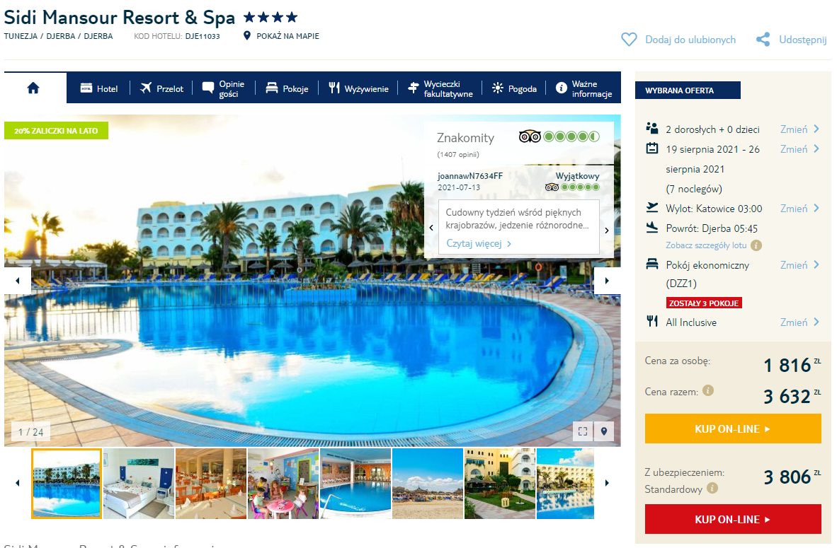 Nie jesteście w stanie zaplanować urlopu mając jedynie kilka dni do wylotu? Skorzystajcie z przedstawionej oferty, gdzie na przygotowania do wyjazdu będziecie mieli ponad 3 tygodni. Djerba oferuje wszystko to, co jest potrzebne do udanego, letniego wypoczynku – wiele piaszczystych plaż, cieplutką wodę w morzu. A do tego o nic nie musicie się martwić, gdyż w podanej cenie otrzymacie pełen pakiet z all inclusive.