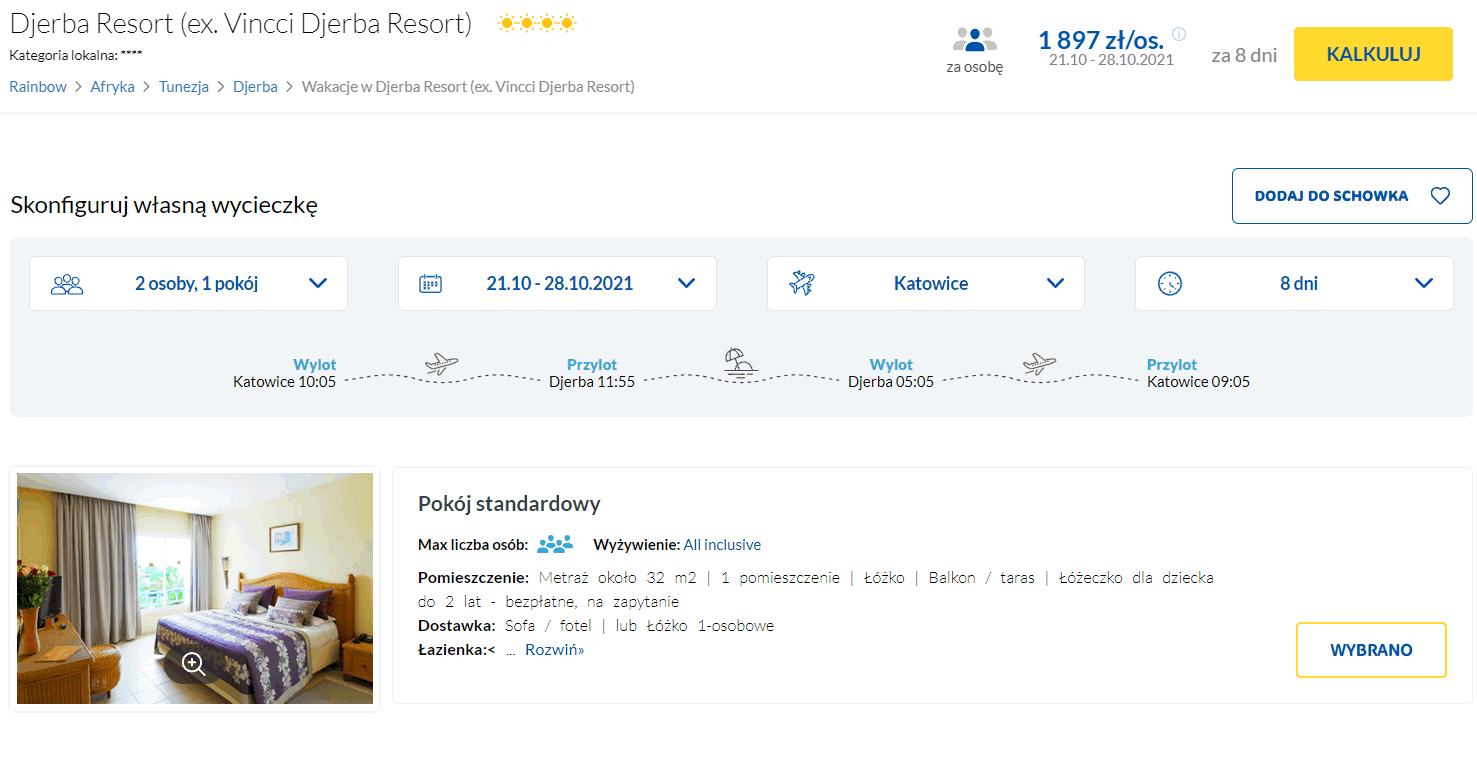 W Tunezji zatrzymajcie się w 4* hotelu Djerba Resort, który położony jest 400 metrów od piaszczystej plaży, w południowej części wyspy Djerba. Wszystkie pokoje w obiekcie wyposażone są w klimatyzację, TV, minibar, telefon, łazienkę oraz sejf. Do dyspozycji gości oddano m.in. baseny (także kryty), 3 restauracje, 5 barów oraz centrum spa. Wybierając ofertę biura podróży Rainbow, w cenę wyjazdu wliczone są również transfery lotniskowe oraz opieka rezydenta na miejscu.