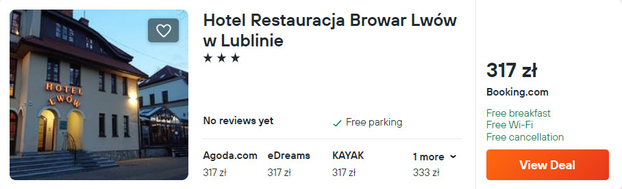 W Lublinie zatrzymaj się w 3* hotelu Restauracja Browar Lwów z ze śniadaniem. Na miejscu będziecie mogli spróbować lokalnie warzonych piw Lwów: Jasne, Bursztyn, Amerykańska Pszenica, Specjal oraz Miodowe.