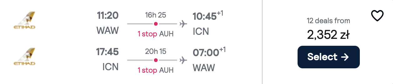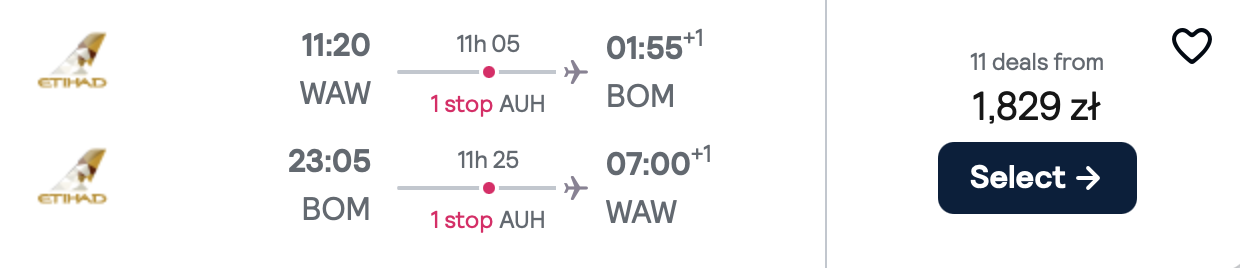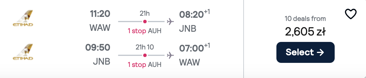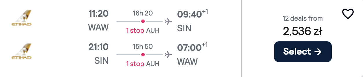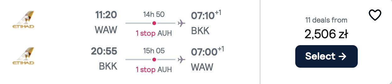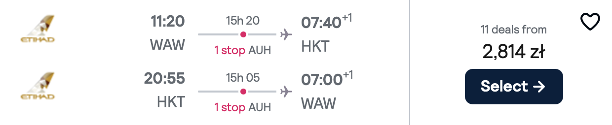 Na każdej z tras polecisz z Etihad Airways i przesiądziesz się w Abu Zabi. WW cenę biletu w najtańszej opcji wliczony jest bagaż podręczny.
