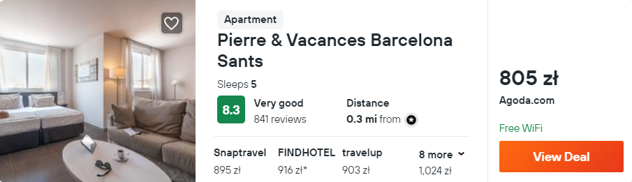 W Barcelonie rekomenduję wam noclegi w hotelu apartamentowym Pierre & Vacances Barcelona Sants. Wszystkie studia składają się z aneksu kuchennego, miejsca do relaksu i spania oraz łazienki z wanną i prysznicem. Na terenie całego obiektu będziecie mieć zapewniony dostęp do sieci WiFi.