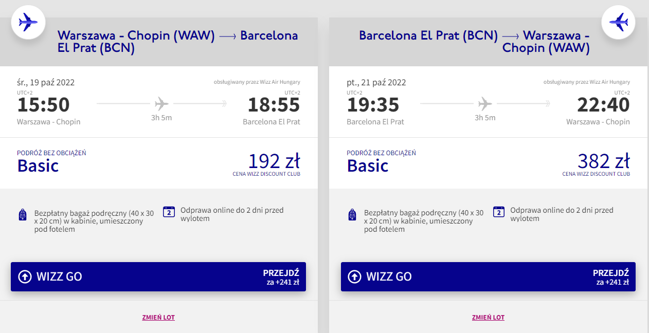 Do Hiszpanii udacie się w terminie 19-21 października z warszawskiego lotniska im. Chopina. W obie strony polecicie na pokładach samolotów linii Wizz Air. Bilety w najniższej cenie dostępne są dla osób z Wizz Discount Club. Chętni na loty bez WDC zapłacą nieco więcej.