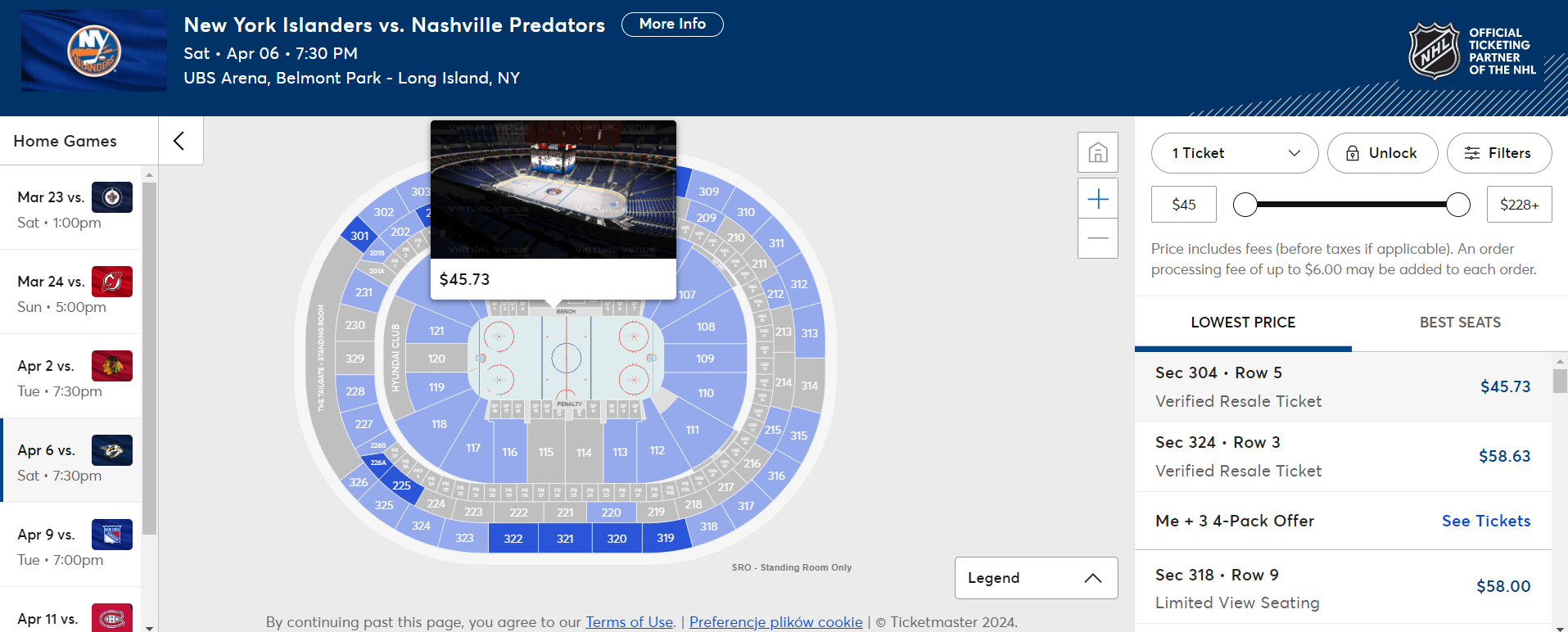 W sobotę 6 kwietnia udaj się do hali UBS Arena na mecz ligi NHL. Na godzinę 19:30 zaplanowane jest spotkanie pomiędzy New York Islanders a Nashville Predators. Bilety (w cenie od 45,73 USD/ok. 181 PLN) na to spotkanie kupisz na stronie ticketmaster.com.