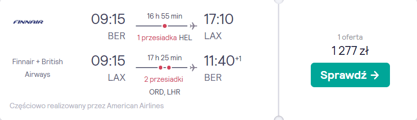 Podróż do Stanów rozpoczniecie i zakończycie na berlińskim lotnisku im. Willy’ego Brandta. W obie strony polecicie na pokładach samolotów linii z sojuszu One World (American Airlines, British Airways oraz Finnair). Bez dodatkowych kosztów całą wycieczkę odbędziecie z bagażem podręcznym oraz przedmiotem osobistym (mały plecak i damska torebka).