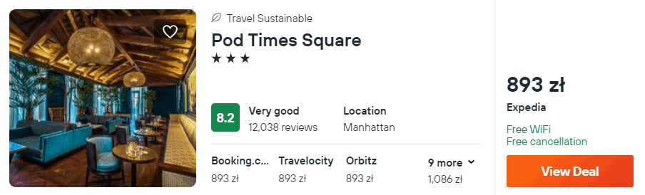 W Nowym Jorku rekomenduję ci noclegi w 3* hotelu Pod Times Square. W każdym pokoju na wyposażeniu znajduje się klimatyzacja z funkcją ogrzewania, telewizor LCD oraz zestaw do parzenia kawy lub herbaty. W łazience jest prysznic, suszarka do włosów oraz podstawowe przybory toaletowe.
