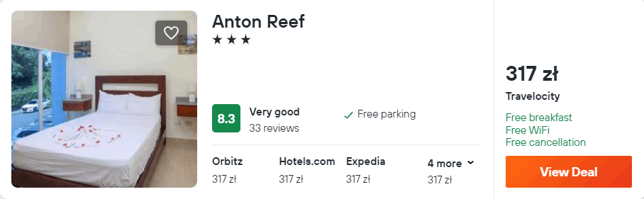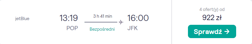 Przygotowana przeze mnie podróż składa się z czterech oddzielnych rezerwacji przelotów: Katowice-Puerto Plata (Dominikana), Puerto Plata-Nowy Jork, Nowy Jork-Berlin oraz Berlin-Kraków. Na Karaibach spędzisz wystarczająco sporo czasu, aby odpocząć, natomiast czasu w Stanach Zjednoczonych starczy ci, aby zobaczyć główne atrakcje Wielkiego Jabłka.