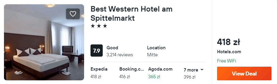 Natomiast w Berlinie zatrzymaj się w 3* hotelu Best Western am Spittelmarkt. Każdy pokój został wyposażony w ogrzewanie, klimatyzację, telewizor LCD oraz czajnik elektryczny. W łazience jest prysznic, suszarka do włosów oraz podstawowe przybory toaletowe.