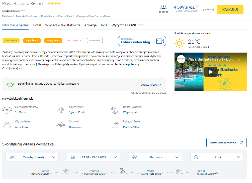 Na wycieczkę wybierzecie się wraz z biurem podróży Rainbow, zatrzymując się w 4* Playa Bachata Resort, jeszcze w tym tygodniu, w terminie: 21 – 29 stycznia. Urlop spędzicie w hotelu położonym tuż nad brzegiem Morza Karaibskiego, przy samej plaży. Dla gości udostępniono m.in. spa z centrum fitness oraz kompleks basenowy. Wszystkie pokoje w obiekcie są klimatyzowane, posiadają prywatną łazienkę, minibar, Wi-Fi oraz telewizor.