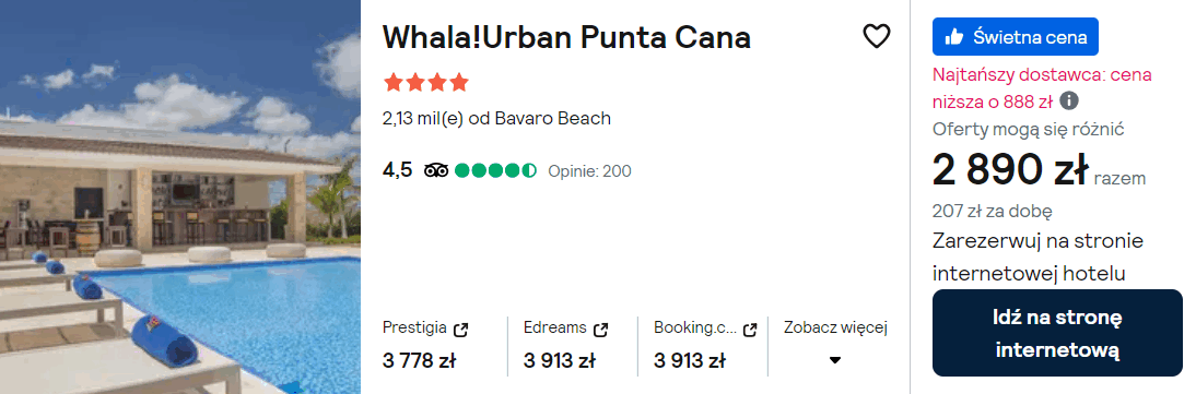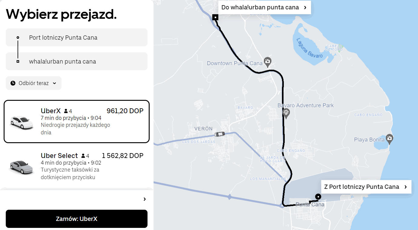 Na miejscu zatrzymasz się w 4* hotelu Whala!Urban Punta Cana, który znajduje się w sąsiedztwie pola golfowego Cocotal Golf & Country Club. Z lotniska do miejsca zakwaterowania dojedziesz Uberem za 961.20 DOP (ok. 66 PLN).