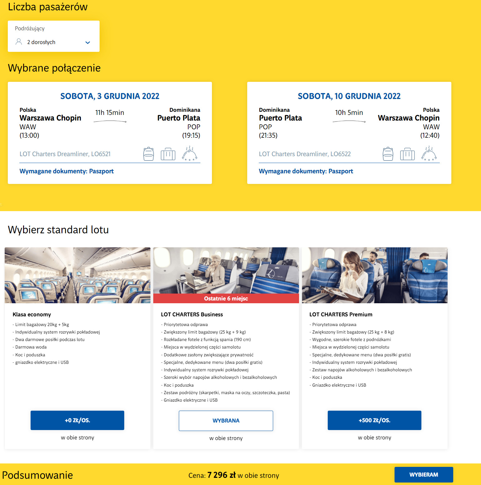 Do Dominikany udasz się z warszawskiego lotniska im. Chopina w terminie 3-10 grudnia. W obie strony polecisz na pokładzie samolotu Boeing 787 Dreamliner należącego do Polskich Linii Lotniczych LOT. Podróż odbędziesz w klasie biznes, gdzie fotele pasażerów rozkładają się do pozycji leżącej.