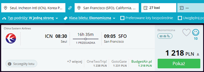 China Eastern Airlines | Seul 08:30 – San Francisco 09:05 | 1218 PLN | 26, 27, 28 kwietnia