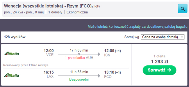 Alitalia | Wenecja 12:00 – Seul 12:05 (+1) | 17, 24 kwietnia