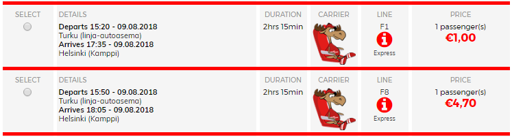 Przewoźnik Onnibus nie udostępnił jeszcze w systemie rezerwacyjnym biletów na przejazdy z Turku do Helsinek. Ceny zaczynają się od 1 EUR + opłata rezerwacyjna.