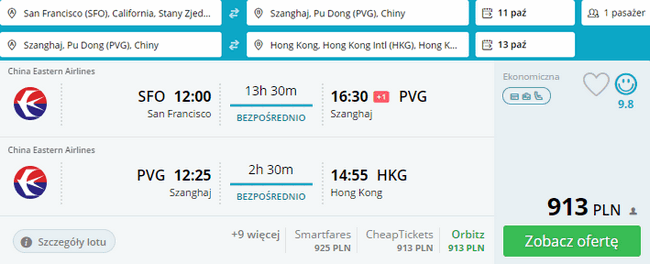 China Eastern | San Francisco 12:00 – Szanghaj 16:30 | 11 października