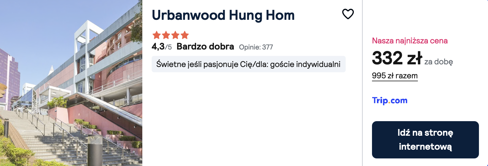 W Hongkongu zatrzymaj się w bardzo dobrze ocenianym 4* hotelu Urbanwood Hung Hom. Jednym z jego największych atutów jest położenie w centrum miasta, co sprawia, że będzie on doskonałą baza wypadową do zwiedzania miasta.