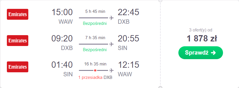 Emirates: Dubaj + Singapur z Warszawy za 1878 PLN