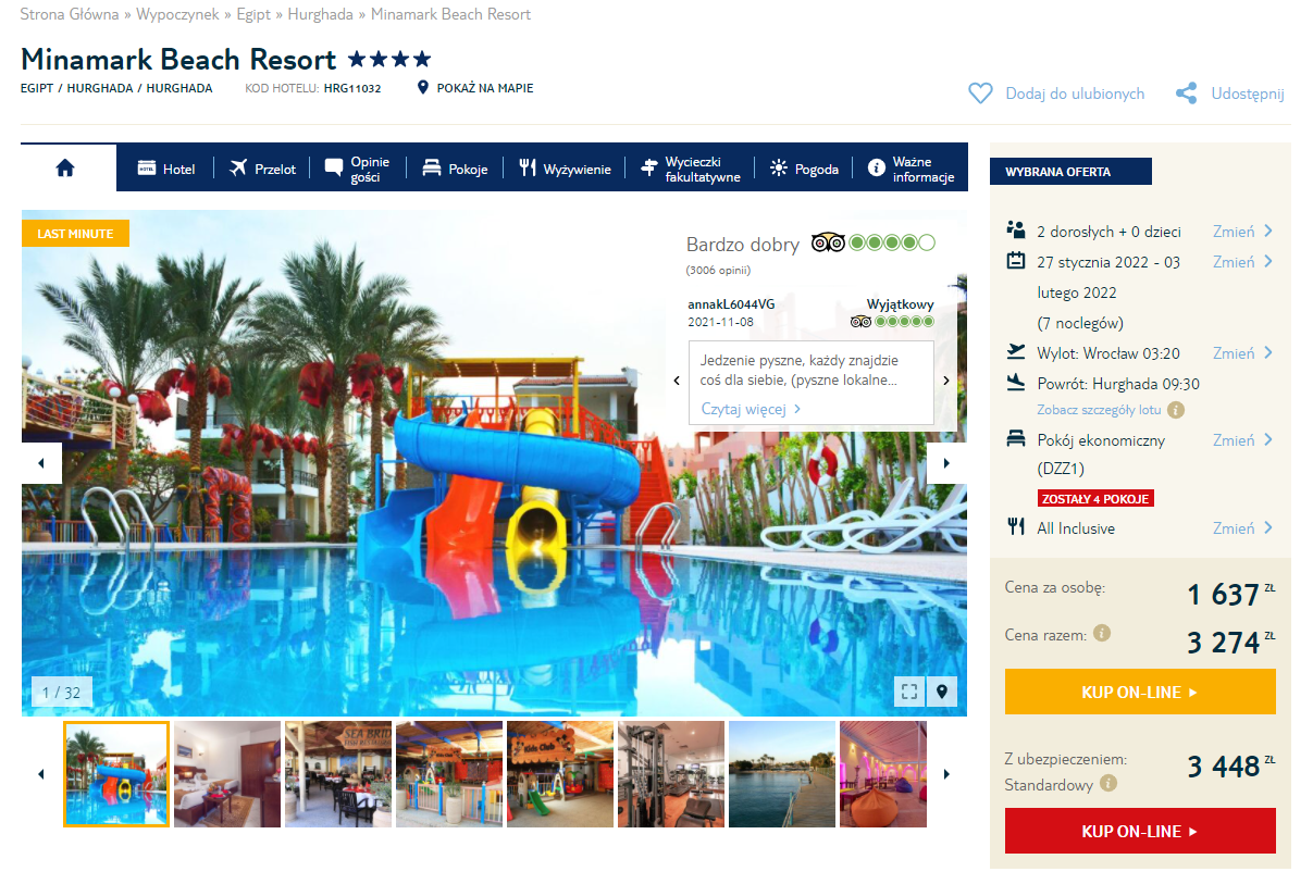 Do Egiptu wybierzecie się w terminie obejmującym ferie zimowe dla województw podlaskiego oraz warmińsko-mazurskiego. W Hurghadzie zatrzymacie się w 4* hotelu Minamark Beach Resort, który położony jest tuż przy piaszczystej plaży. Do dyspozycji gości oddano m.in. basen, aquapark, tematyczne restauracje, bary, plac zabaw dla dzieci, strefę spa oraz centrum fitness. Każdy pokój wyposażono w klimatyzację, telewizor LCD, sejf oraz prywatną łazienkę z prysznicem.
