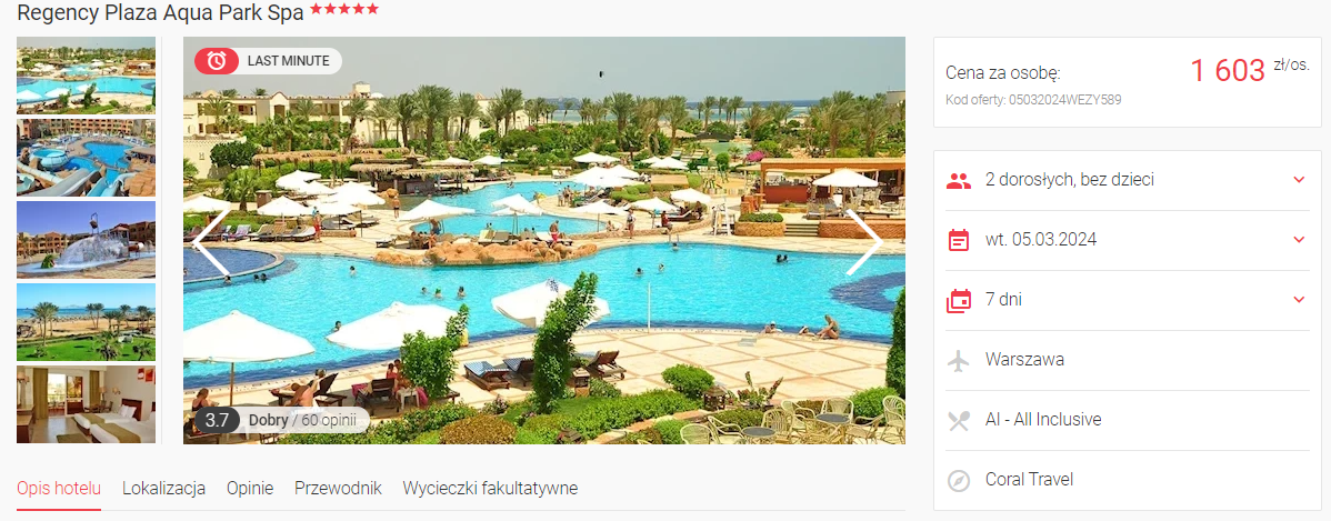 Do Egiptu udasz się w terminie 5 – 12 marca. Czeka cię bezpośrednia podróż z Warszawy do Szarm el-Szejk linią PLL LOT. W cenie możesz zabrać bagaż rejestrowany.