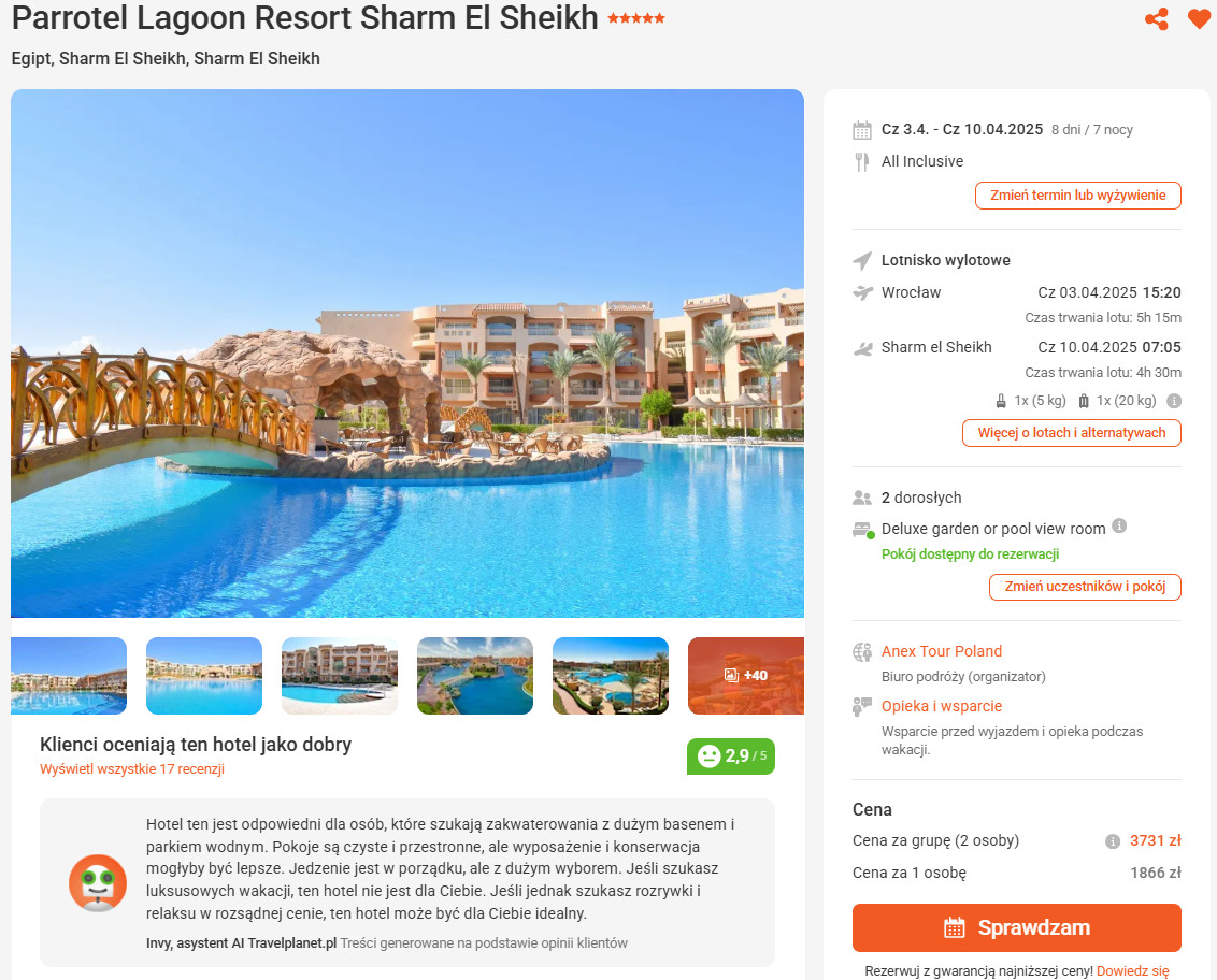 Na wczasy do Egiptu polecisz w terminie 3-10 kwietnia bezpośrednio z Wrocławia. W cenie zabierzesz ze sobą bagaż rejestrowany (nadawany do luku) i podręczny.