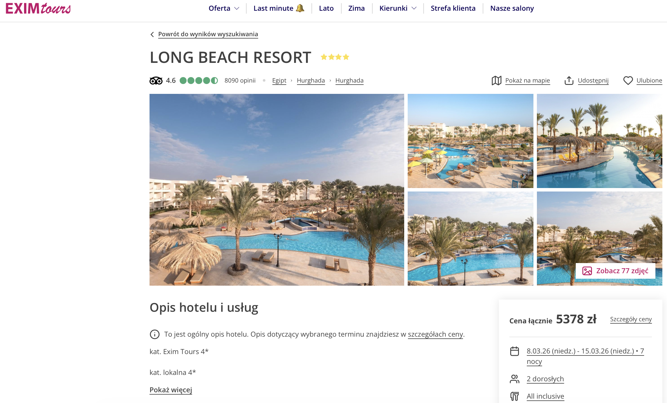 W Egipcie zatrzymasz się w Long Beach Resort, który oferuje bezpośredni dostęp do piaszczystej plaży. Goście chwalą obiekt za przestronne pokoje, czyste baseny i różnorodność potraw w restauracji. Szczególnie doceniają życzliwość personelu oraz możliwość nurkowania i snorkelingu tuż przy hotelu. Ośrodek dysponuje kilkoma basenami, w tym basenem z podgrzewaną wodą, centrum nurkowym oraz animacjami dla dzieci i dorosłych.