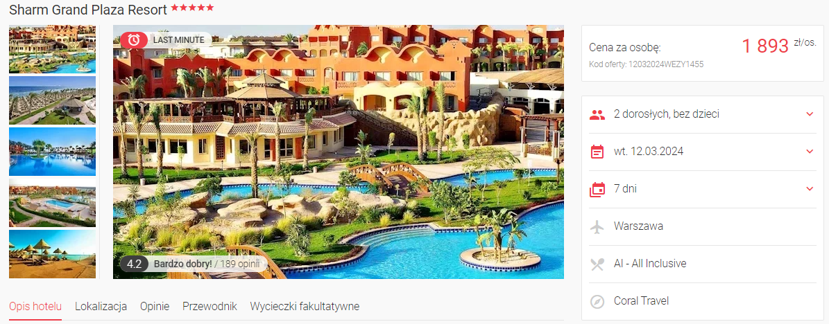 Do Egiptu udasz się w terminie 12 – 19 marca. Czeka cię bezpośredni lot z Warszawy do Szarm el-Szejk, realizowany PLL LOT.