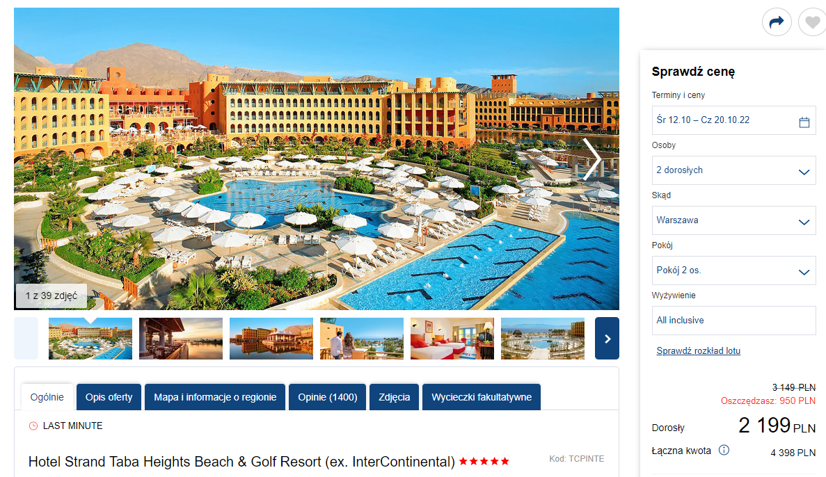 Na urlop do Egiptu udacie się w terminie 12 – 19 października. Czeka was bezpośredni lot z Katowic lub Warszawy do Taby, realizowany na pokładzie samolotu linii lotniczej Smartwings. W podróż będziecie mogli zabrać ze sobą bagaż rejestrowany.