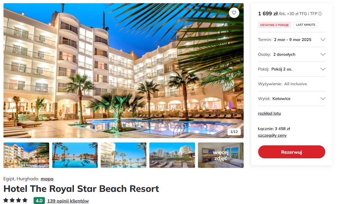 Spędzisz tydzień w 4* hotelu The Royal Star Beach Resort. Obiekt znajduje się w centrum tętniącej życiem Hurghady i ma dostęp do prywatnej plaży. Jeżeli stwierdzisz, że woda w Morzu Czerwonym nie jest wystarczająco ciepła, zawsze możesz skorzystać z podgrzewanego basenu.