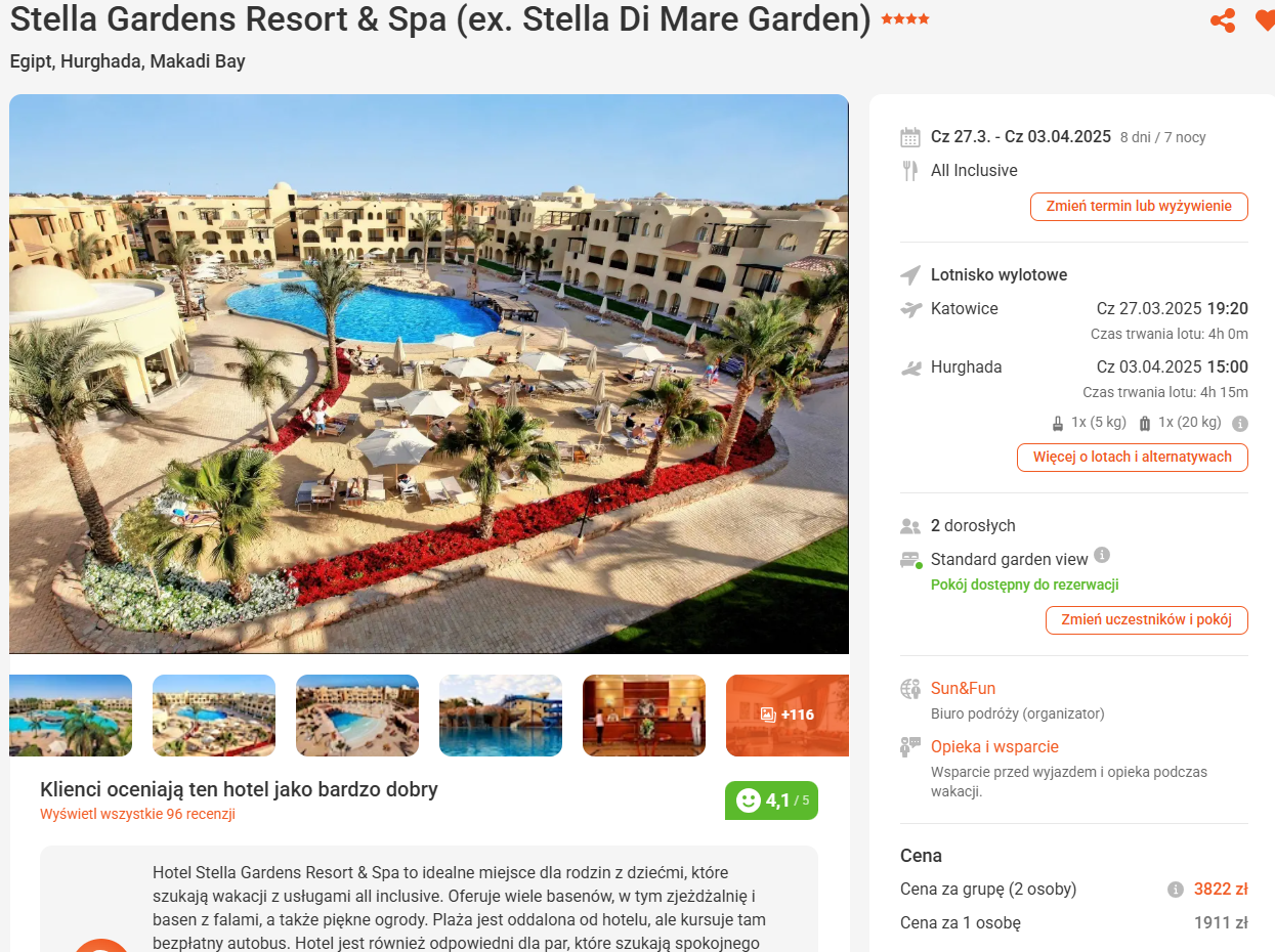 Zatrzymasz się w 4* hotelu Stella Gardens Resort & Spa. Na miejscu do dyspozycji będziesz miał basen, taras słoneczny z parasolami, klimatyzowane pokoje z balkonem, zaplecze rekreacyjne oraz dedykowane animacje. Na plażę kursuje bezpłatny hotelowy bus.
