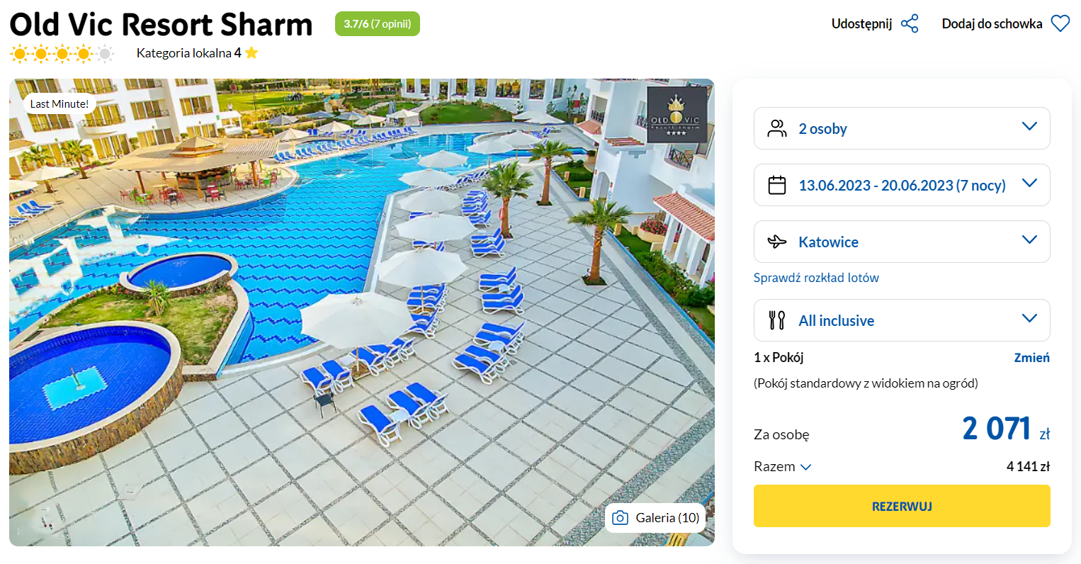 Na miejscu zatrzymasz się 4* hotelu Old Vic Resort Sharm. Na terenie obiektu znajduje się sporych rozmiarów odkryty basen oraz brodzik dla najmłodszych. Każdy pokój został wyposażony w klimatyzację, telewizor LCD, lodówkę i czajnik elektryczny. W łazience jest wanna z prysznicem, suszarka do włosów oraz podstawowe przybory toaletowe.