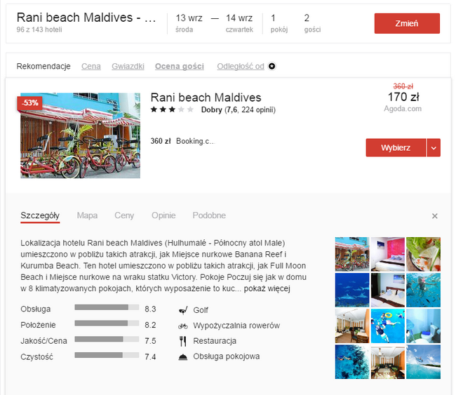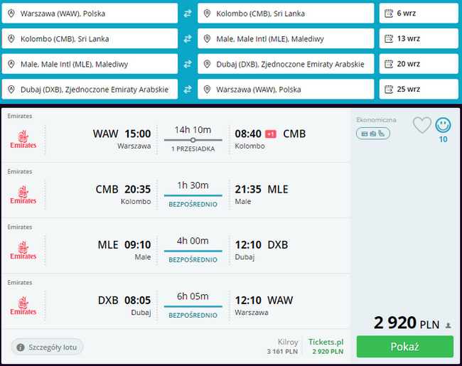 Emirates | Warszawa 15:00 – Kolombo 08:40 | 2920 PLN | 6, 13, 20, 27 września oraz 4, 11 października Emirates | Kolombo 20:35 – Male 21:35 | 13, 20, 27 września oraz 4, 11, 18 października Emirates | Male 09:10 – Dubaj 12:10 | 20, 27 września oraz 4, 11, 18, 25 października Emirates | Dubaj 08:05 – Warszawa 12:10 | 25 września oraz 2, 9, 16, 23, 30 października