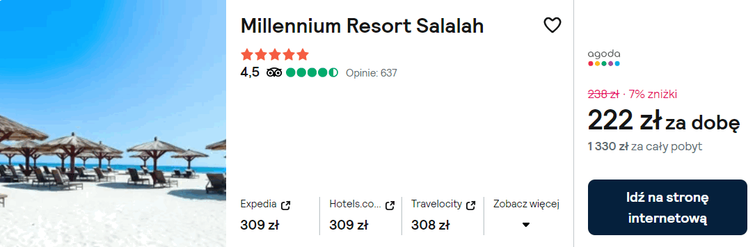 Natomiast na południowym wybrzeżu Omanu proponuję ci noclegi w 5* hotelu Millennium Resort Salalah z basenem. Znajduje się on w spokojnej okolicy miasta Salala. Na terenie całego obiektu będziesz miał zapewniony dostęp do sieci WiFi.