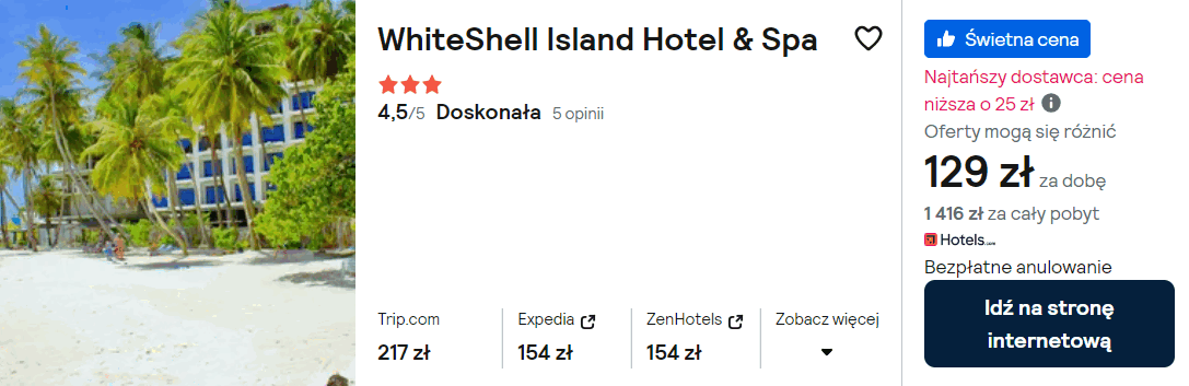 Na wyspie Maafushi postaw na pobyt w 3* WhiteShell Island Hotel & Spa. Wszystkie pokoje są klimatyzowane i posiadają łazienkę z prysznicem, suszarką do włosów. Ponadto dla gości przygotowano podstawowe przybory toaletowe.