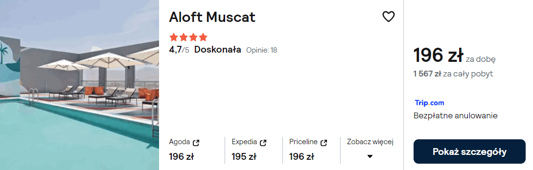W stolicy Omanu zatrzymaj się w 4* hotelu Aloft Muscat z odkrytym basenem na dachu. Każdy pokój wyposażony jest w klimatyzację, telewizor LCD oraz minibar. W łazience jest prysznic oraz suszarka do włosów.