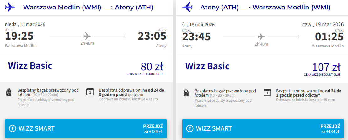 Do Grecji polecisz w terminie 15 – 18 marca. Czeka cię bezpośredni lot z Warszawy (Modlin) do Aten z Wizz Air. Najtańsze bilety zarezerwują posiadacze Wizz Discount Club, pozostałe osoby zapłacą nieco więcej. Nie masz WDC? Zarezerwuj swoje bilety tutaj.