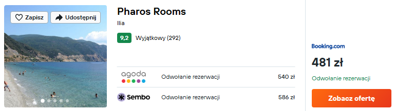 Wybrałem noclegi w rodzinnym pensjonacie Pharos Rooms. Obiekt znajduje się niedaleko plaży i będzie doskonałą bazą wypadową w trakcie wycieczki.