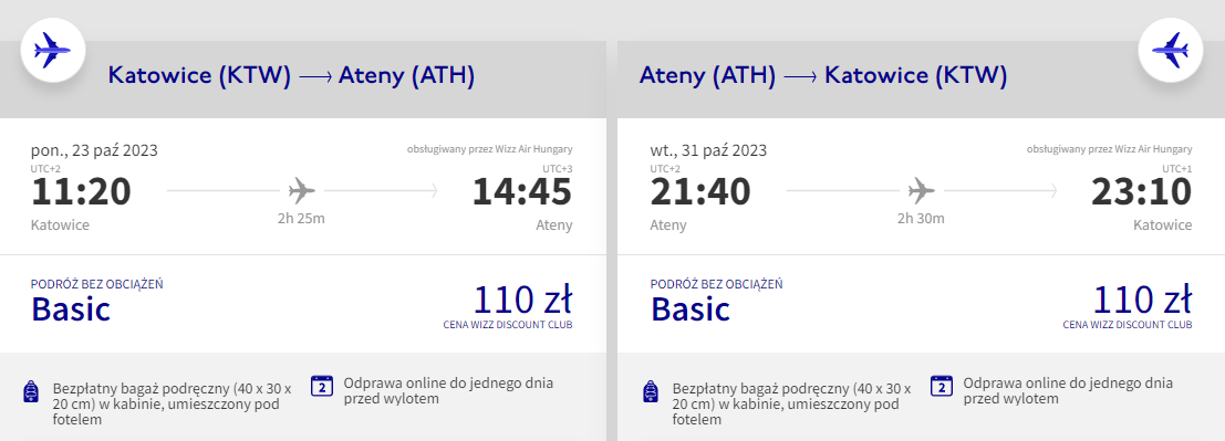 Na wycieczkę udasz się w terminie 23 – 31 października. Czeka cię bezpośredni lot z Katowic do Aten, realizowany na pokładzie samolotu linii lotniczej Wizz Air. Bilety w najniższej cenie zakupią członkowie Wizz Discount Club, pozostałe osoby zapłacą nieco więcej. Tutaj dowiesz się więcej na temat klubu zniżkowego węgierskiego przewoźnika.
