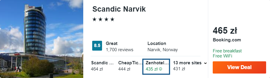 Dowiedzcie się więcej o tym hoteluPreferujecie nowoczesne obiekty? Wybierzcie 4* hotel Scandic Narvik, który cieszy się doskonałą opinią wśród dotychczasowych gości. Pokoje w obiekcie są klimatyzowane i posiadają bezpłatny dostęp do internetu. W przypadku tego obiektu w cenę pobytu wliczone są również śniadania.