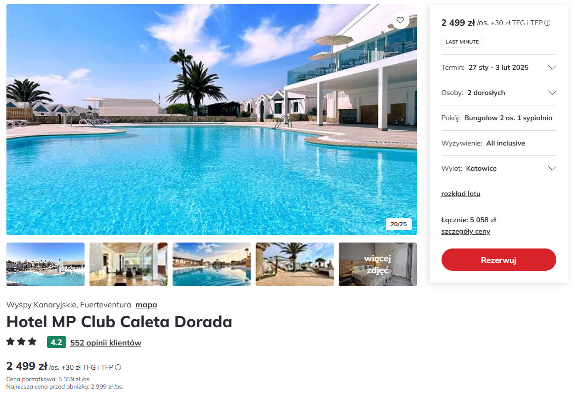 Na hiszpańskiej wyspie zatrzymasz się w 3* hotelu MP Club Caleta Dorada, który znajduje się w miejscowości Caleta de Fuste, w odległości 10 minut spacerem od plaży. Na terenie obiektu mieszczą się trzy baseny (jeden ze zjeżdżalniami) oraz wodny plac zabaw dla dzieci. Każdy bungalow składa się z aneksu kuchennego, salonu, sypialni, łazienki oraz balkonu.