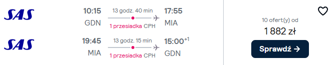 Do Stanów Zjednoczonych wybierzesz się w styczniu oraz lutym – w czasie ferii zimowych. Do Miami polecisz linią Scandinavian Airlines System z lotnisk w Gdańsku lub Warszawie. Po drodze przesiądziesz się w Kopenhadze. W cenę biletu został wliczony bagaż podręczny.