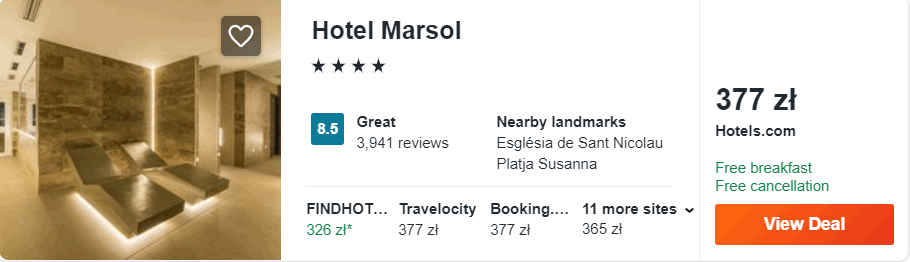 Natomiast w 4* hotelu Marsol w cenie zakwaterowania zapewnione będziecie mieli codzienne śniadania, dostęp do krytego basenu (z podgrzewaną wodą) oraz sieci WiFi. Obiekt od plaży Lloret de Mar oddalony jest o jedyne 50 metrów.