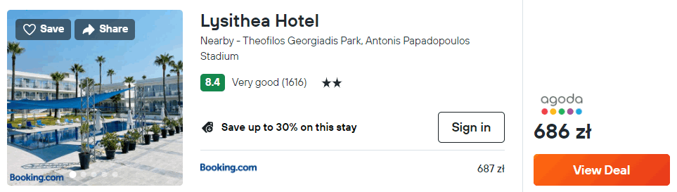 Na Cyprze zatrzymasz się w hotelu Lysithea, który znajduje się w spokojnej części miasta, tuż przy plaży CTO Pyla. Z lotniska w okolice miejsca zakwaterowania (przystanek Eac Dekeleia Roundabout 1) dojedziesz autobusem nr 425 lub wypożyczonym samochodem.