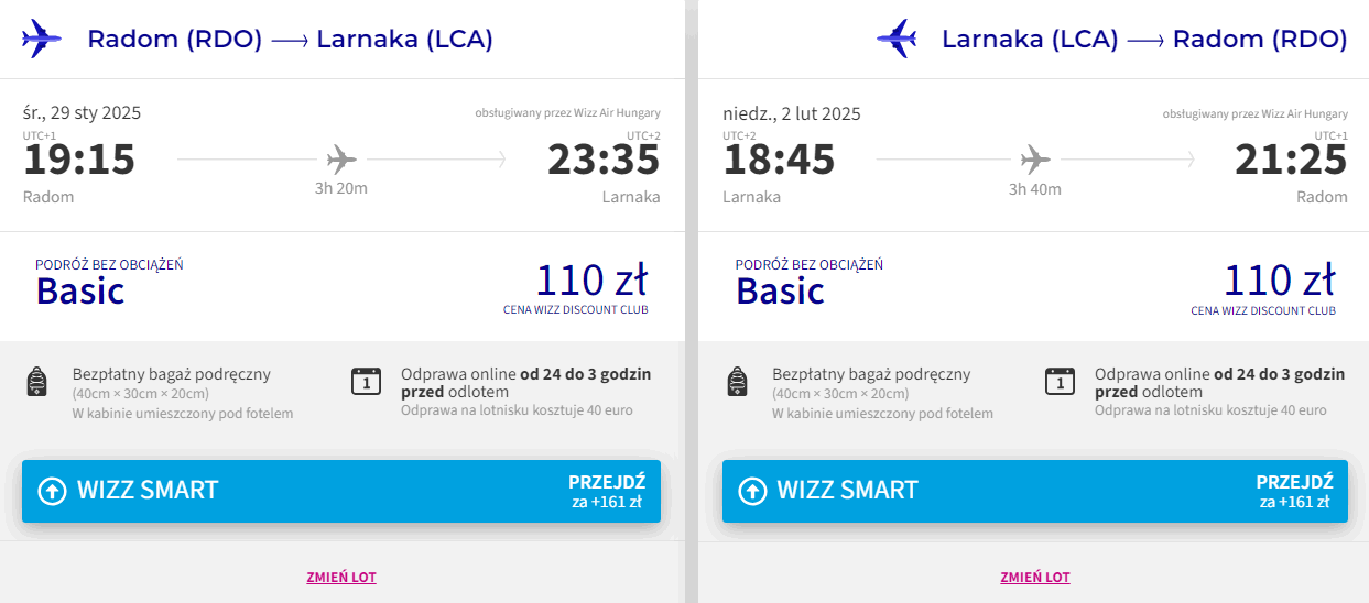 Na Wyspę Afrodyty udasz się z Radomia w okresie trwania ferii zimowych w województwach: kujawsko-pomorskim, lubuskim, małopolskim, świętokrzyskim oraz wielkopolskim. W obie strony polecisz linią Wizz Air z bagażem podręcznym. Bilety w najniższej cenie dostępne są dla członków Wizz Discount Club. Chętni na loty bez WDC zapłacą więcej.