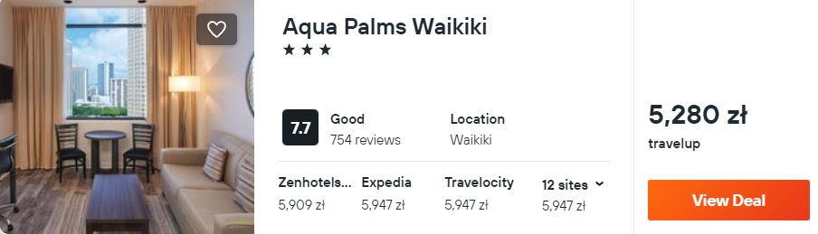 Na miejscu zatrzymasz się w hotelu Aqua Palms Waikiki. Dotychczasowi goście bardzo pozytywnie oceniają pobyt w tym obiekcie. Obiekt zlokalizowany jest w pobliżu plaży.