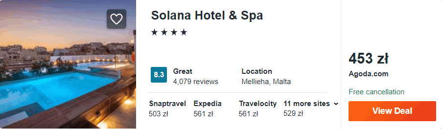 Na Malcie polecam wam noclegi w 4* hotelu Solana & Spa, który znajduje się na północy wyspy, w sąsiedztwie zatoki Mellieħa. Na miejscu czekają na was nowocześnie urządzone pokoje z łazienkami, dobrze wyposażone centrum fitness, kryty basen oraz odkryty basen na dachu wraz z tarasem.