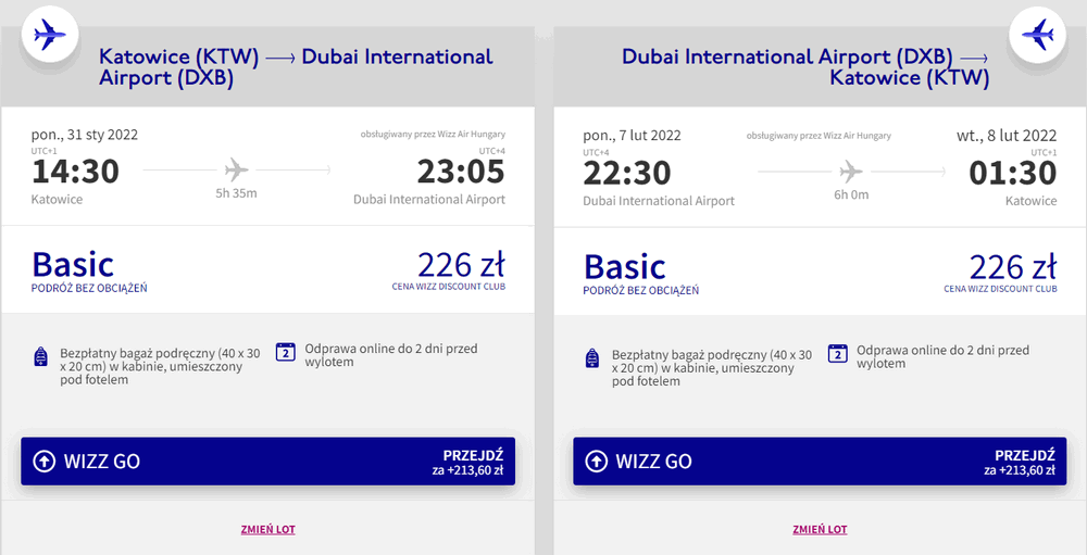 Podróż rozpoczniecie i zakończycie na katowickim lotnisku w Pyrzowicach. W obie strony polecicie bezpośrednio na pokładach samolotów linii Wizz Air z wliczonym małym bagażem podręcznym – a za bilety do Dubaju zapłacicie tylko 452 PLN/os.! Pamiętajcie, że w takiej kwocie dostępne są one dla członków Wizz Discount Club, chętni na loty bez WDC zapłacą nieco więcej.