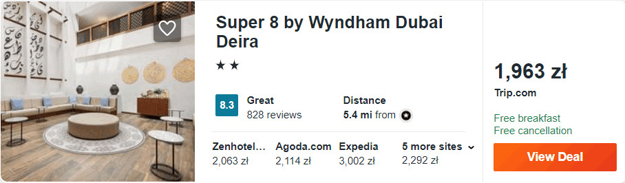 W Dubaju zatrzymacie się w bardzo dobrym hotelu Super 8 by Wyndham Deira, który znajduje się w odległości 500 metrów od złotego targu. Z lotniska (DXB – terminal 3) w okolice miejsca noclegowego dojedziecie (z przesiadką) czerwoną i zieloną linią metra, a za bilet zapłacicie 4 AED (ok. 5 PLN).