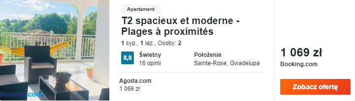 Na Martynice wybrałem dla was noclegi w Appartement Hibiscus Martinique, gdzie czeka na was w pełni wyposażone studio z tarasem. Na Gwadelupie rekomenduję zatrzymać się w przestronnym (70 m²) apartamencie T2 spacieux et moderne – Plages à proximités ze wspaniałym widokiem na okolicę!