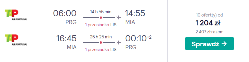Do Miami podróżować będziecie z praskiego lotniska im. Václava Havla na pokładzie samolotu linii TAP Air Portugal z przesiadkami w Lizbonie. W cenie biletu zabrać ze sobą będziecie mogli bagaż podręczny oraz przedmiot osobisty (mały plecak lub damską torebkę).