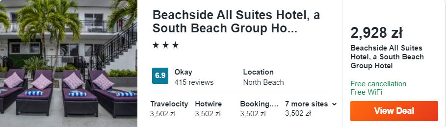 Na Florydzie zakwaterowani będziecie w 3* hotelu Beachside All Suites Hotel, który znajduje się w Miami, w dzielnicy North Beach. Z międzynarodowego lotniska w okolice hotelu dojedziecie komunikacją miejską za niespełna 10 PLN.